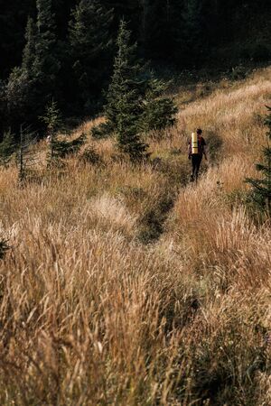 KYIV, UKRAINE - AUGUST 24, 2019: back view of tourist walking with backpack in golden field