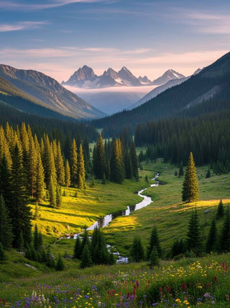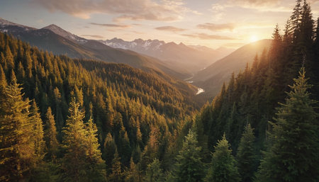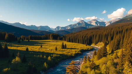 A sunlit mountain valley a clear river winding through a dense, green pine forest under a bright blue sky.