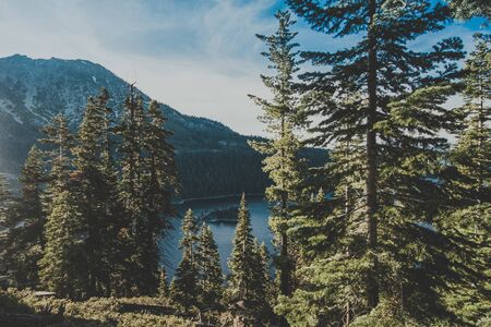 Emerald Bay view with Fannette Island in South Lake Tahoe California in the Sierra Nevada mountains. Golden hour