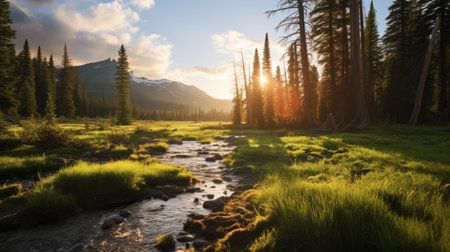 a breathtaking scenery landscape featuring majestic mountains basking in the warm glow of the sun. this photo captures the essence of a playstation 5 screenshot, with impressionist-landscapes and photo-realistic details. the 32k uhd resolution brings out the beauty of the minimalistic serenity, creating a cabincore vibe that could easily grace the pages of national geographic. ai generated
