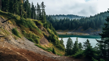 lake landslide scenery unfolds between towering pine trees, showcasing nature's fury as the tranquil water's edge meets the rugged, rocky slope, surrounded by lush greenery, creating a dramatic contrast of serenity and chaos in this breathtaking landscape photograph. ai generated