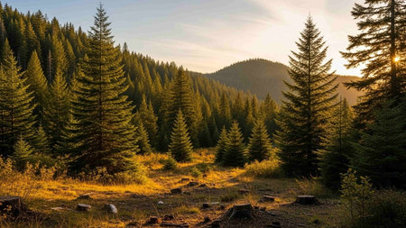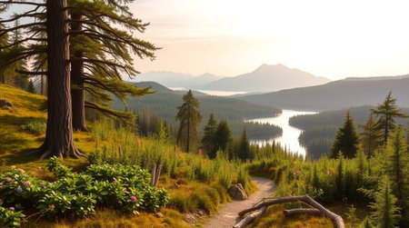 A mountain forest with tall pines and a winding trail, perfect for hiking and exploring nature's beauty
