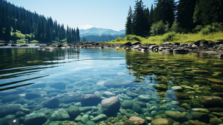 a serene view of a tundra lake framed by tall pine trees. the calm waters reflect the surrounding landscape, creating a peaceful atmosphere. ai generated