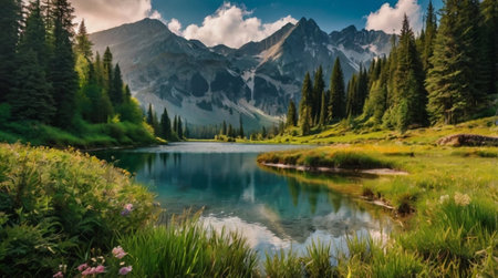 A breathtaking landscape shot that would serve well as a wallpaper or in a nature-themed calendar, it is also suited for environmental articles or travel-inspired material | Here, we have a majestic alpine lake cradled by rugged mountain peaks, mirroring a clear blue sky. The waters exhibit brilliant reflections, creating a symphony of tranquil blues and vivid greens with the surrounding pine forests. In the foreground, wildflowers seem to celebrate the season, injecting vibrant hues of yellow, pink, and green into the composition, which ultimately brings forth a sense of vibrant life juxtaposed against the timeless grandeur of the mountains. Sunlight filters through the scene, bathing it in bright, natural light, ensuring each element from the delicate blossoms to the grandiose mountain slopes is presented in stunning clarity. One can almost feel the freshness of the mountain air and the peacefulness that pervades this secure spot | This image holds particular value for outdoor enthusiasts, serving as an inviting backdrop for websites or promotional content that encourages exploration and the appreciation of nature's beauty. It is equally appealing for mindfulness and meditation resources, offering a visual escape into a calm and undisturbed world. The florid foreground adds a layer of depth to the image, hinting at the biodiversity and the thriving ecosystem within these serene surroundings and could be of interest to botanical publications | a vivid landscape photograph featuring an alpine lake with crystal clear reflections nestled among mountain peaks, dappled with sunlight and adorned with wildflowers, evoking tranquility and natural splendor