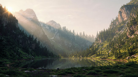 Serene trail on the edge of an alpine lake at dawn., generative AI