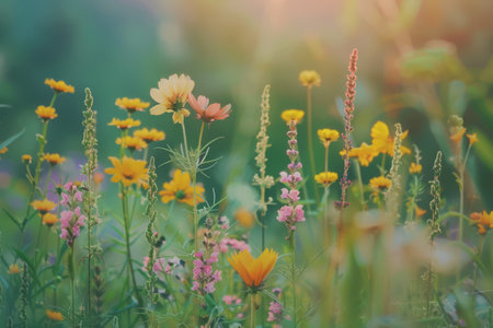 A stunning display of vibrant wildflowers blooming in a sunlit field, capturing the essence of nature's beauty with soft colors and serene ambiance.