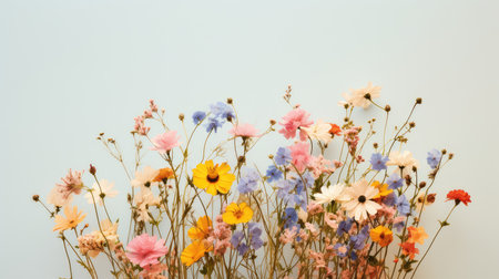 Close-up of colorful wildflowers blooms with a soft blue backdrop. The image showcases natural textures with a focus on details. The lighting suggests a bright day. The composition provides copy space. It can be used for various projects needing a floral theme.