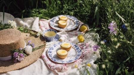 Relaxing summer picnic in green meadow featuring lemon tarts, tea, straw hat, and wildflowers on a white blanket