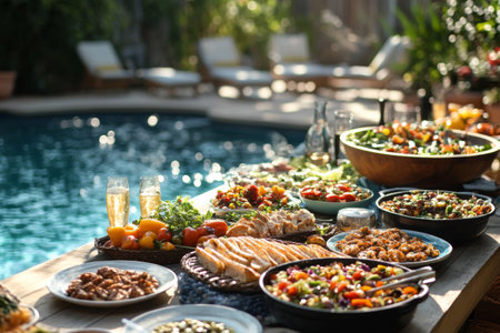 A vibrant spread of various dishes is arranged on a table beside a serene pool.