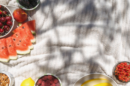 Concepts of food at summer season. White blanket with various summer fruits, including watermelon, cherries, raspberries, and lemon, top view. Inspiration of garden picnic on weekend