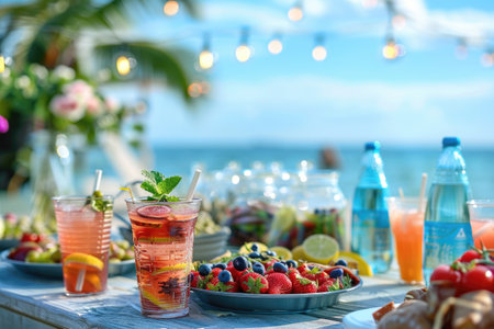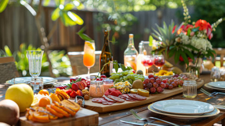 outdoor summer gathering, an appetizing summer spread on a wooden table adorned with fresh fruits and refreshing drinks, ideal for a sunny backyard gathering