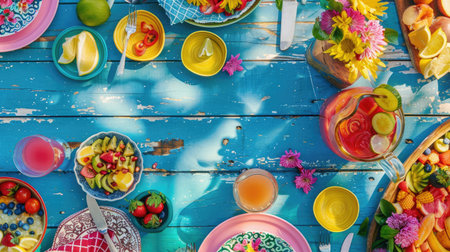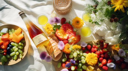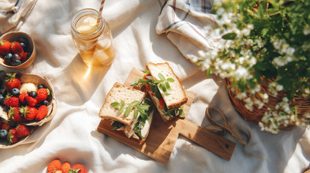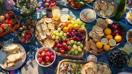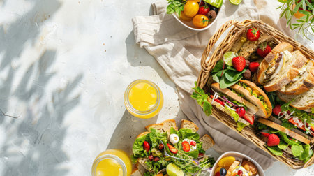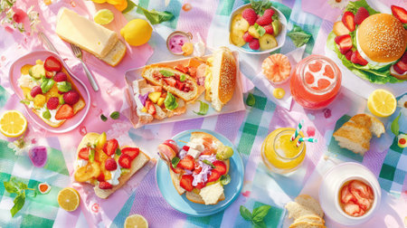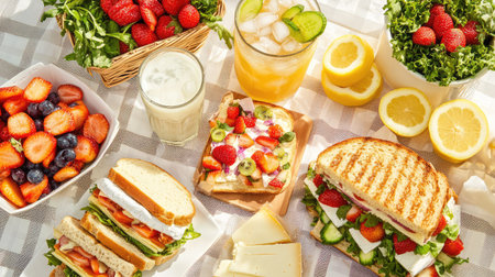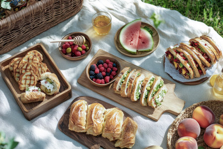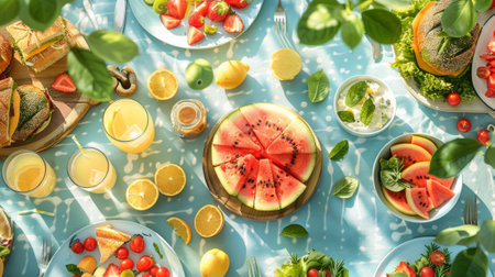 This vibrant picnic spread features an array of fresh fruits, colorful sandwiches, and refreshing drinks. Perfect for summer gatherings, it captures the joy of outdoor dining with delightful flavors.