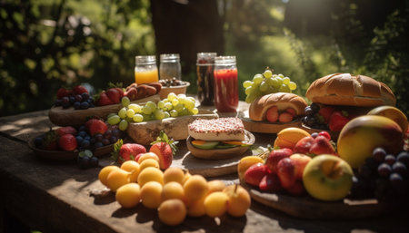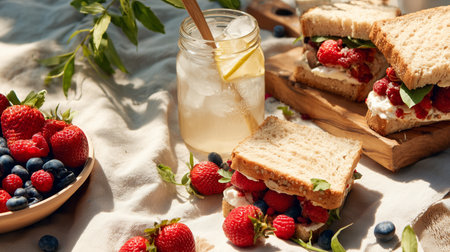 A table adorned with an assortment of mouthwatering sandwiches and fresh fruits, creating a tempting display, An outdoor picnic spread with sandwiches, fruit, and lemonade, AI Generated