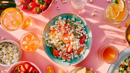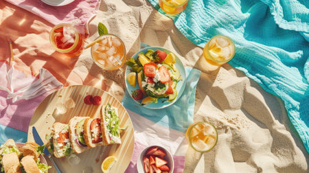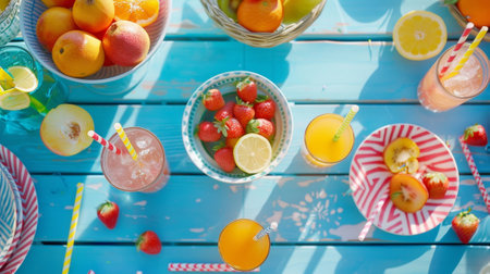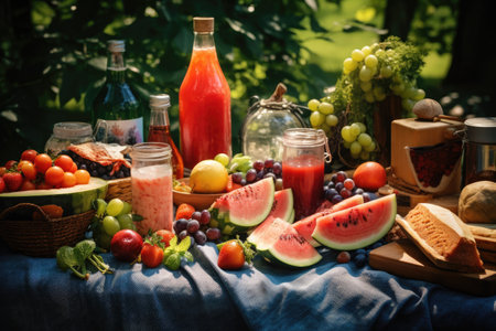 A vibrant and colorful picnic setup featuring a spread of fresh fruits, sandwiches, and refreshing drinks under the summer sun.