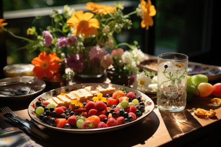Fruit skewers on the grill, flowery field and a picnic in a botanical garden., generative AI