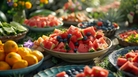 A vibrant summer feast with fresh watermelon slices, strawberries, and blueberries on a sunny outdoor table surrounded by assorted fruits.