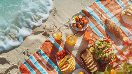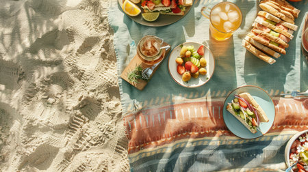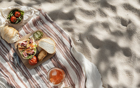 Picnic setup on sandy beach with sandwiches, fresh vegetables, and cold drinks. Striped cloth and wicker basket create a relaxing summer outdoor dining scene.