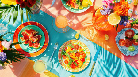 An intricate table setting with colorful dishware and drinks arranged in a circular pattern, resembling a painting of a vibrant aquatic organism AIG50