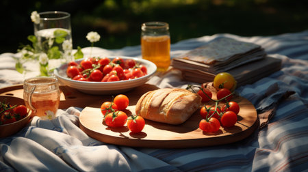 Healthy vegan food served on picnic blanket photo, ai generated. Fresh and tasty snacks on lawn grass image background wallpaper. Outdoors meal on summer weekend concept picture realistic