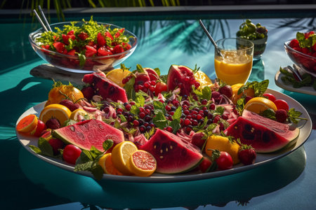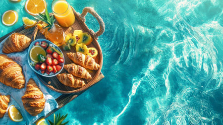 Enjoy a vibrant breakfast by the pool featuring fresh fruit, croissants, and refreshing orange juice, perfect for a sunny summer morning.