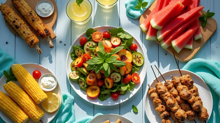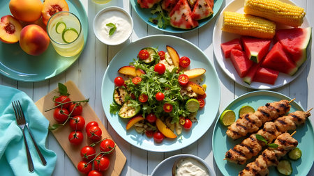 Table full grilled sweet corn fresh peach salad chilled drinks meats