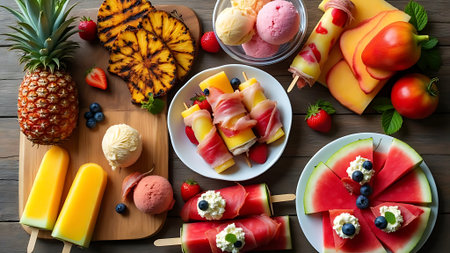 Charcuterie skewers with fruit cheese popsicles and grilled pineapple setup