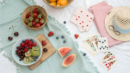 Summer beach picnic with fruit and snacks, leaving plenty of space for copy
