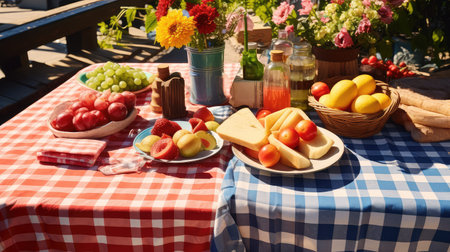 A picnic spread with tableware, fruit, and flowers on a plaid blanket. Enjoy natural foods, vegetable dishes, and a beautiful outdoor event AIG50