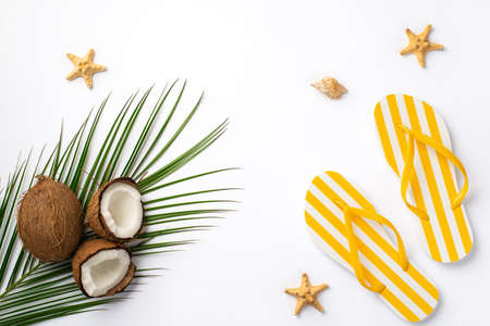 summer concept. Top view photo of yellow striped flip-flops coconuts starfishes shell and palm leaves on isolated white background