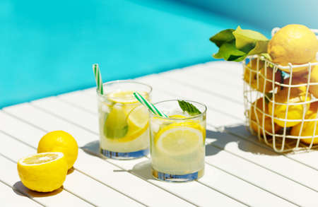Homemade lemonade in glasses with lemon slice, basket of lemons, drinking straw,on white table,in the edge of the pool with turquoise blue water background,light and shadows, vocation 2021,summertime