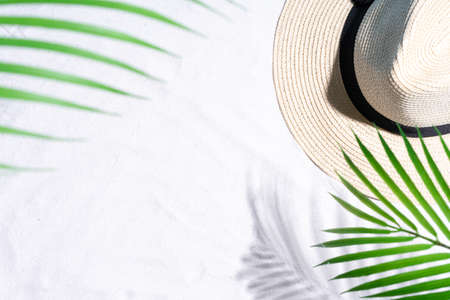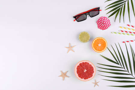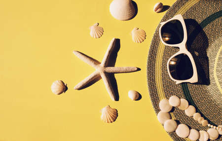 Beach accessories: glasses and hat with shells and sea stars on a white background. Summer background