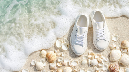 A pair of white sneakers rests on a sandy beach, surrounded by delicate seashells and softly lapping waves, creating a serene summer atmosphere.
