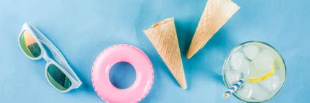 Summer holidays vacation concept background, hat, sunglasses, cooling drink (lemonade, mojito) with ice, ice cream cones, Lifebuoy blue background copy space flatlay above banner