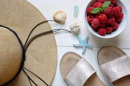 Raspberries, straw hat, slippers and shells on white background