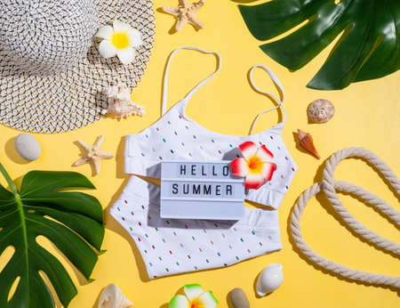 Summer and vacation concept. Words Hello Summer on the lightbox with swimming suit, tropical leaves and seashells flat lay on orange background