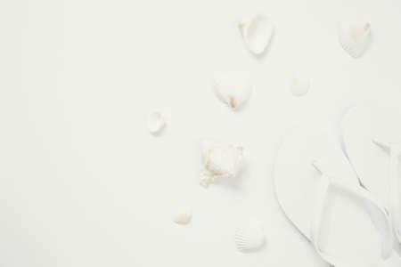 White flip flops and sea shells on the white background. Horizontal