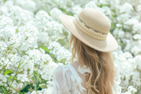 Portrait of a beautiful young woman in white dress and hat sitting in the park.