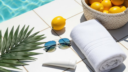 Lemons, sunglasses and towel on the swimming pool background.