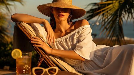 fashion outdoor photo of beautiful sensual woman with dark hair in elegant dress and straw hat relaxing on summer beach