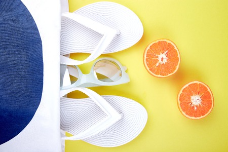 Summer beach bag with white flip flops, sunglasses, seashells, orange fruit on yellow background. Flat lay. Top view. Copy space.
