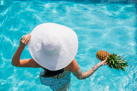 Overhead view of woman in sun hat holding pineapple in swimming pool