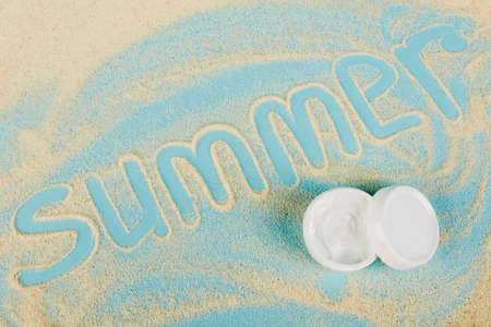 top view of summer lettering made of sand near cosmetic cream on blue surface