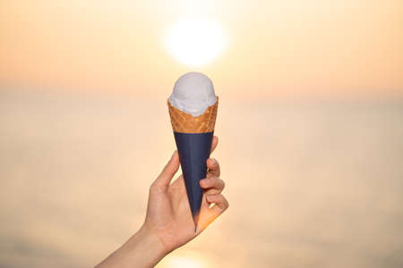 Scoop ice cream with a waffle cone in hand on the beach, sunset moment.