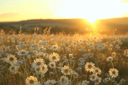 Majestic sunset over daisy field on sunny day, high quality image capturing the serene beauty