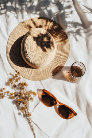 A brown straw hat rests on a white cloth alongside trendy sunglasses and a glass of beverage. Dried flowers complete the cozy summer setup, enjoying gentle shadows and sun rays.