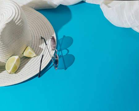 John Lennon style sunglasses. White hat and a piece of fabric all ready for the beach. Blue background. Concept set.