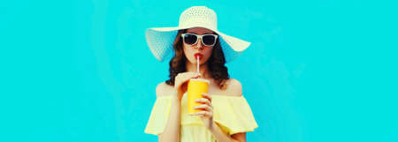 Portrait of beautiful young woman drinking a fresh juice wearing a summer hat on blue background