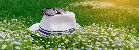 White hat and sunglasses on green grass on sunny summer day, soft focus. Lawn with spring flowers, natural background. Concept of recreation, vacations. Banner for advertising with copy space.