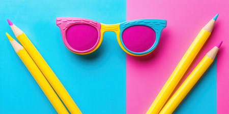 Colorful sunglasses and pencils on a split pink and blue background creating a vibrant aesthetic