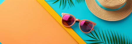 Summer creative background with summer objects. Top view from above